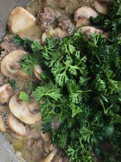 8.Environ 5 minutes avant de servir le plat, ajouter le vin et la crème- doucement mélanger et saupoudrer de persil frais. Bon appéttit!