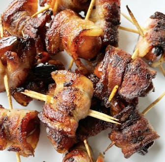 2. Enrouler le bacon autour de chaque datte et mettre en place avec un cure-dents.