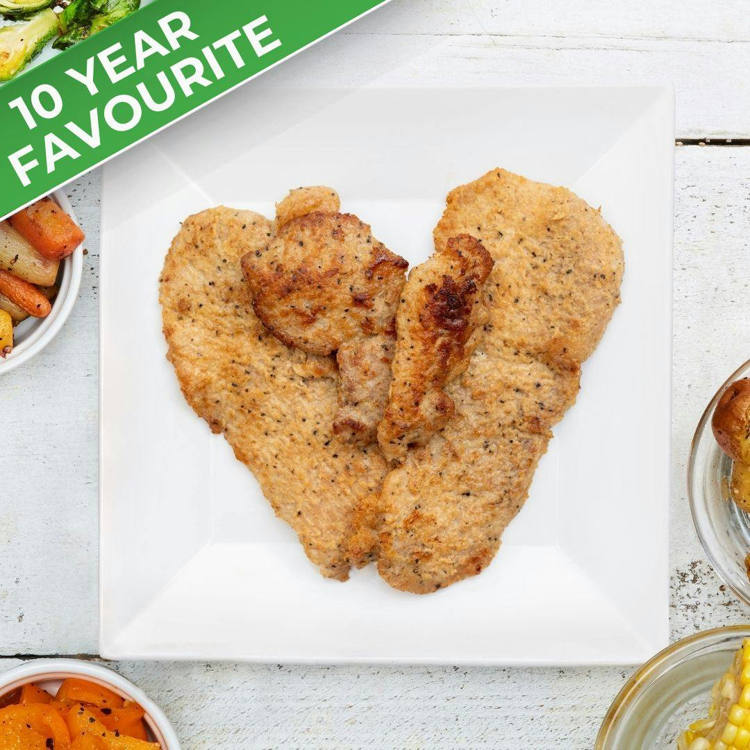 COOKING TIP: 3Gen Organics’ pork schnitzel comes pre-coated with salt, pepper, and breadcrumbs, so it is ready for the pan as soon as it is thawed. Heat a generous amount of oil over medium-high, as you want it nice and crispy. Add the schnitzel and cook for about 3 minutes per side, since these thin cuts cook quickly. Serve with creamy mashed potatoes for a classic meal or make a schnitzel sandwich topped with coleslaw for a satisfying crunch.