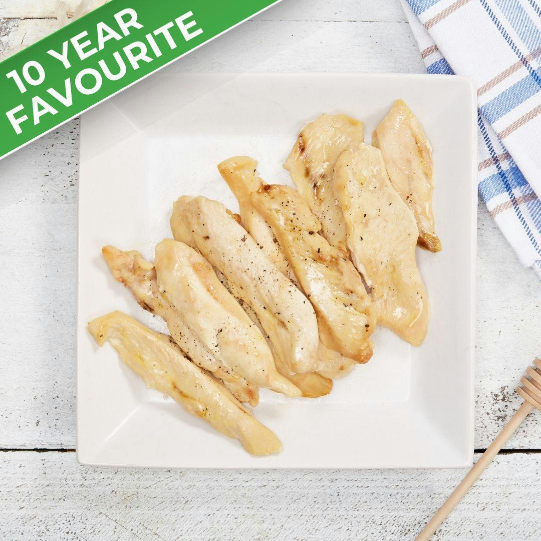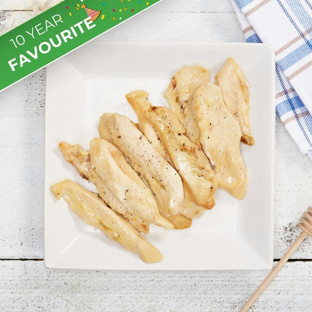 Cory Van Groningen raises his chickens on a lush hilltop farm in Cayuga, ON that's been in his family since the 1970s. Their chickens spend their lives entirely outdoors on cattle pastures, which promotes healthier land as part of multi-livestock sustainable farming practices. Don't worry, they have small huts to protect them from predators. These chicken strips are cut from all-white breast meat and are non-breaded.