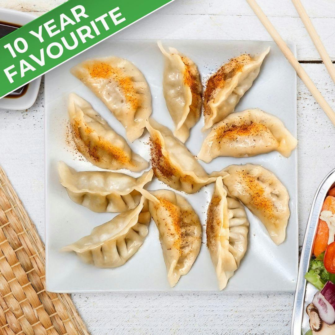 COOKING TIP: Heat a medium-sized pan over medium-high heat and add 3 tablespoons of cooking oil. Arrange the frozen gyozas in a single layer, flat side down, and sear them for 1 to 2 minutes until the bottoms turn golden brown. Next, pour in ½ cup of water or broth, reduce the heat to medium-low, and cover the pan. Let the gyozas steam for about 5 minutes, or until the liquid has fully evaporated. Remove the lid and cook for an additional minute to crisp up the bottoms once more. Serve immediately and enjoy! Cook thoroughly to an internal temperature of 165º F (74º C).