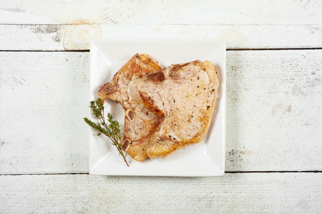 COOKING TIP: Season the bone in pork chops with salt and pepper, then sear them in a hot pan with a little olive oil until golden on both sides. Add a spoonful of butter, a crushed garlic clove, and a sprig of rosemary, and spoon the melted butter over the chops as they finish cooking to an internal temperature of 145°F. Remove the chops to rest, then splash a bit of chicken stock into the pan, stir in a small spoon of Dijon, and let it simmer for a minute to create a quick pan sauce. Pour the sauce over the chops and serve.