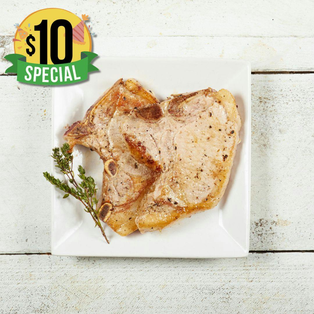 These 8oz Bone in Pork Chops are cut from the prized section just behind the rib cage and before the ham. Known as bone in loin chops, they are the pork equivalent of a classic beef striploin. Naturally lean like a boneless tenderloin, each chop benefits from the flavour boosting bone, keeping the meat juicy, tender, and richly satisfying.