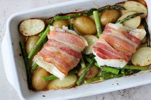 - Placer les morceaux de morue par-dessus les asperges et les patates. Retourner le plat au four pour 15-20 minute, jusqu’à-ce que je bacon soit bien cuit et croustillant.
